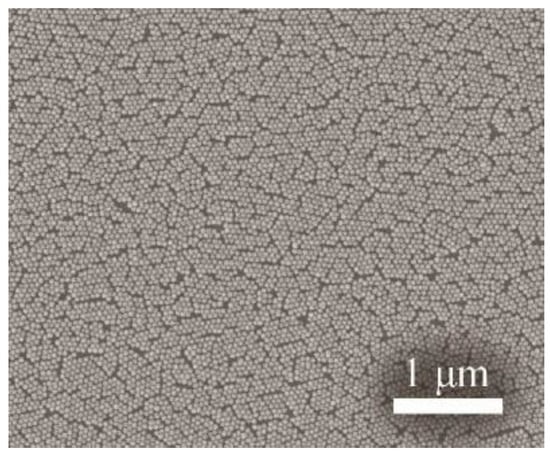 The formed layer was then mechanically compressed by using a movable wall of the vessel to ensure the closest packing of the nanoparticles. The compression was followed by lowering the water level until the entire layer was transferred onto the silicon wafer surface. The prepared monolayer was subsequently annealed at 500 °C for 2 h. Then, the self-assembled monolayer was coated with 20 nm of Au using a high-resolution sputter coater (Cressington 208HR). The AuSiO2 substrates were characterized by scanning electron microscopy (SEM, JEOL JSM-7500F). The typical SEM image of a monolayer of SiO2 nanospheres (50 nm) covered by 20 nm of Au is shown in Figure 2. It shows a very homogeneous packing density in the μm-scale.