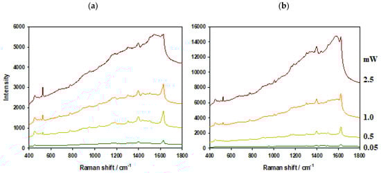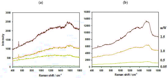 The background in the typical SERS spectrum is connected with photoluminescence of metal substrate []. In all spectra, the background is more pronounced for AuPS than for AuSiO2 substrates. In the case of bare substrates and high laser powers (1 and 2.5 mW), the background is about eight times higher for AuPS substrates in comparison to AuSiO2 ones.