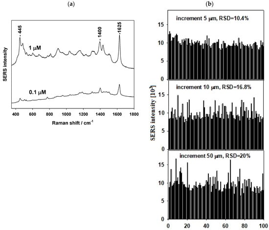(a) SERS spectra of methylene blue and (b) spectral reproducibility (RSD—relative standard deviation of the signal) from 10 × 10 spectral maps of various increments.