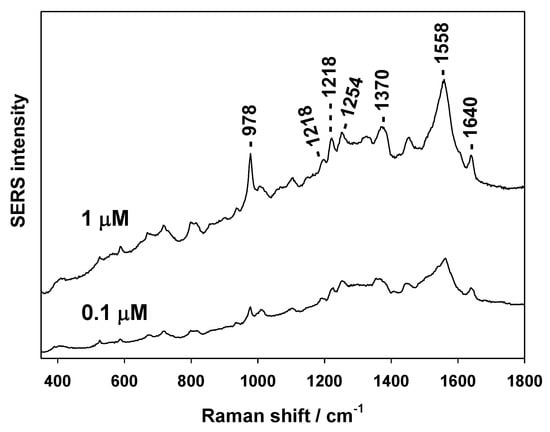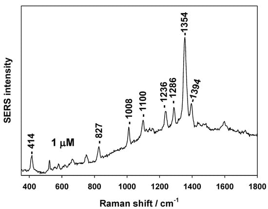 In our previous papers, we reported an application of AuFON substrate based on Polystyrene (PS) spheres (107 nm in diameter, 20 nm gold coating) [,]. We were able to quantify the amount of colorant azorubine in sweet drinks [] as well as to detect several biologically important molecules such as porphyrins, nucleic acids, benzocaine, and alkaloids []. However, polymer surfaces are not efficient in heat transfer (i.e., heat dissipation). Laser irradiation of the SERS substrate can lead to an increase of the local temperature and causes the thermal degradation of metallic nanostructures and/or adsorbed analyte. Degradation of the metallic nanostructure causes a significant increase of the spectral background connected with photoluminescence of the metal []. Moreover, decomposition of the analyte results in a decrease of the intensity of spectral bands, and the appearance of graphitic carbon spectral features (two broad peaks around 1200–1700 cm−1) []. In the case of AuFON substrates, we found that the Raman spectrum of PS, a mainly strong peak at 1000 cm−1, can also interfere in SERS spectra of the studied analyte []. Therefore, there is a need for inexpensive and stable SERS-substrates which can easily dissipate heat. Such substrates are expected to provide a SERS signal using high laser powers.