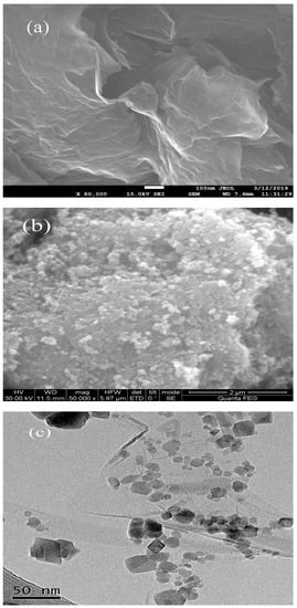 In order to study the morphological and microstructural details of GO/Fe3O4, SEM images of GO and GO/Fe3O4 were conducted and presented in Figure 1a,b. A TEM image of GO/Fe3O4 was shown in Figure 1c.