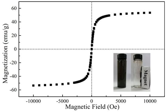 The magnetic property of GO/Fe3O4 was researched by measuring the field-dependent magnetization curve at room temperature. As shown in Figure 2, the saturation magnetization of Fe3O4/GO was as high as 53.57 emu/g, manifesting the high magnetic performance of the prepared material. The magnetization of Fe3O4/GO increased with the increase of the applied magnetic field strength and increased to a saturation value. The hysteresis loop was a smooth S-shape and coincided well without remanence magnetization, which indicated that the Fe3O4/GO was superparamagnetic and was easy to be collected from the adsorption process.