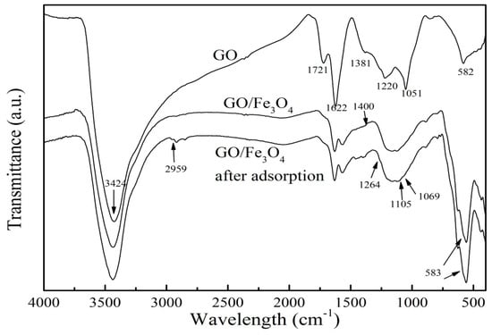 FTIR spectrum was used to identify the characteristic functional groups of GO/Fe3O4. Figure 3 presented the FTIR of GO, GO/Fe3O4, and GO/Fe3O4 after adsorption. In the infrared spectrum of GO, the broad peak at 3424 cm−1 represented the O–H stretching vibration, which formed a hydrogen bond with an oxygen atom of the adsorbed water molecule. The stretching vibration of the C=O bond in the carboxyl group was identified via the peak at 1721cm−1. The peak at 1622 cm−1 was associated with the stretching vibration of C=C of the aromatic ring. The peaks at the 1381 cm−1, 1220 cm−1, and 1051 cm−1 were attributed to the stretching vibrations of C–H and C–O bonds. The functional groups on the surface and edges of GO improved its hydrophilicity. Compared to the GO spectrum, some peaks had slightly changed in the spectrum of GO/Fe3O4 due to the attachment of Fe3O4 particles. The weakened peak observed at 3424 cm−1 may be attributed to an increase of Fe3O4 and a decrease of GO in the prepared material. Another strong peak at 583 cm−1 may be due to the fact that an overlap occurred between a peak of GO at 582 cm−1 and the characteristic peak of Fe3O4 at 583 cm−1, which demonstrated that Fe3O4 particles were successfully loaded onto the GO. A significant vibration band formed at 1400 cm−1, which was attributed to the formation of either a monodentate complex or a bidentate complex between the carboxyl group and Fe on the surface of the Fe3O4 particles [28]. After PRO adsorption onto GO/Fe3O4, new peaks appeared at 1105 cm−1 and 1069 cm−1, signifying the C–O–C stretching of the aryl alkyl ether in PRO. A weak peak at 2959 cm−1 was connected with N-H stretching in secondary amines of PRO. A significant peak at 1264 cm−1 represented the formation of hydrogen band between the oxygen atom in the epoxy group and the PRO molecule.