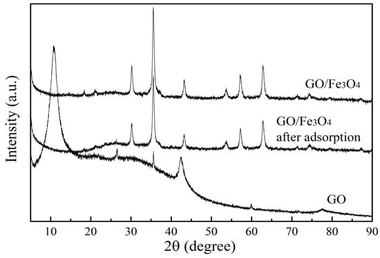 XRD of GO, GO/Fe3O4, and GO/Fe3O4 after adsorption.