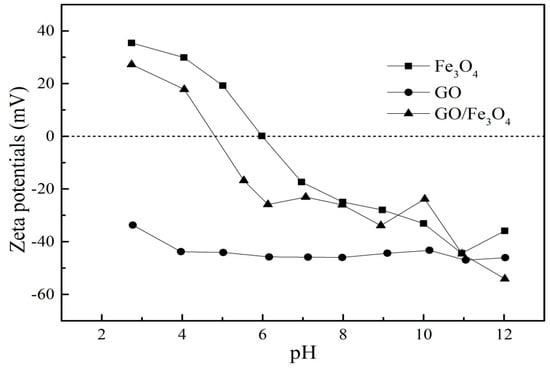 Zeta potential of GO, Fe3O4, and GO/Fe3O4 were exhibited in Figure 5. The zeta potential of GO was negative at the test pH range, illustrating that the surface of GO was charged negatively. The zero-potential point of Fe3O4 was about pH = 6. When pH < 6, the surface of the Fe3O4 was positively charged. When pH > 6, negative charges dominated on the surface of Fe3O4. It can be observed that the values of GO/Fe3O4 were between GO and Fe3O4, indicating that the surface charge of GO was changed due to the loading of Fe3O4.