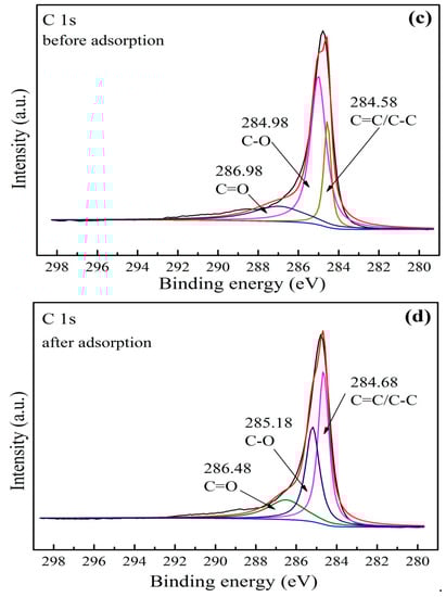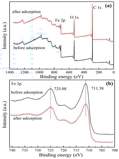 The XPS spectra of GO/Fe3O4 before and after the adsorption of PRO with binding energies ranging from 0 to 1400 eV was acquired for the identification of the surface elements and performance of a quantitative analysis. It was obvious in Figure 6a that the peaks of Fe 2p, O 1s, and C 1s were found in the full scan spectrums before and after adsorption of PRO, which suggested the existence of Fe, O, and C in the GO/Fe3O4. For the high-resolution Fe 2p of GO/Fe3O4 (Figure 6b), the binding energies of 711.38 and 725.38 eV corresponded to Fe2+ and Fe3+, which indicated the successful synthesis of Fe3O4 nanoparticles and loading onto the surface of GO. The finding was consistent with the above characterization results. From Figure 6c,d, the C=O, C–O, and C=C/C–C characteristic bonds were present at around 284.5, 285, and 286.5 eV, respectively. It can be observed that the peak intensity of C=C/C–C after adsorption became stronger than that of C=C/C–C before adsorption, which was attributed to the introduction of PRO. The elemental content was given in Table 1. It can be seen that the carbon content after adsorption was significantly increased compared with before adsorption, which also indicated that PRO was successfully adsorbed onto GO/Fe3O4. The elemental carbon contained in PRO led to an increase in the total carbon content. The successful adsorption of PRO was also illustrated by nitrogen. The content of nitrogen increased from 0.47 to 0.87, which was caused by the amino group in PRO. At the same time, it can be seen that the content of Fe was reduced, and it was speculated that the decrease of Fe was caused by the leaching of Fe during the reaction, which was discussed in detail below. The increase in the content of other elements, especially carbon, led to a relative decrease in the proportion of oxygen.