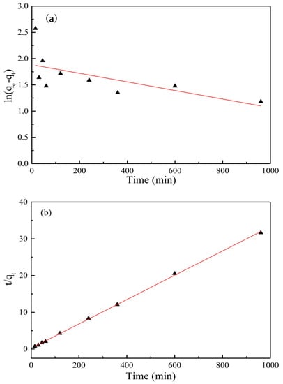 Adsorption kinetics curves of PRO onto GO/Fe3O4: (a) pseudo-first-order and (b) pseudo-second-order.