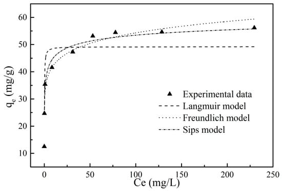 Experimental data were fitted by Langmuir, Freundlich, and Sips isotherm models, respectively.