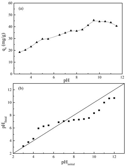(a) Effect of pH on the adsorption of PRO onto GO/Fe3O4, and (b) the variation tendency of pH after the adsorption equilibrium was reached (C0 = 25 mg/L, V = 20 mL, m = 0.01 g, t = 24 h).