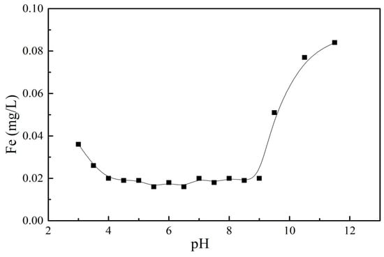 To determine the stability of the material, the amount of Fe in the solution was determined after the adsorption equilibrium was reached. Figure 11 showed the amount of Fe leaching at different pH levels. When the pH was between 4 and 9, the Fe element was hardly leached, but was easily leached under strong acid or alkali conditions. The results suggested that GO/Fe3O4 can be used in a wide range of neutral water.