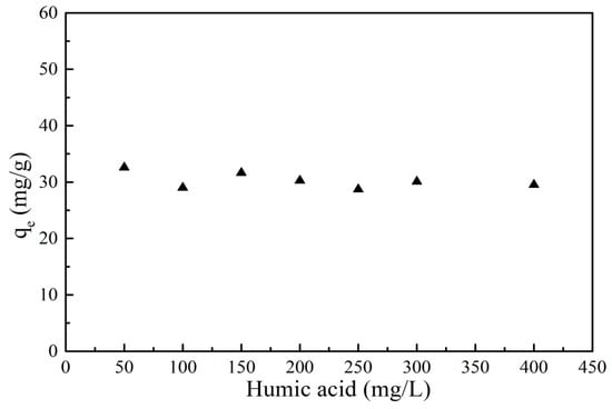 HA, widely distributed in water, can interact with organic matter. HA has an important influence on the migration behavior of PRO in the environment. The effect of HA on the adsorption of PRO onto GO/Fe3O4 under different HA concentrations is shown in Figure 12. The presence of HA had a little effect on the adsorption of PRO onto GO/Fe3O4. The adsorption capacity dropped slightly and then remained constant. HA surface was negatively charged as the pH of the solution was above 2 [30]. The pH condition for this experiment was 7.5. Thus, both HA and GO/Fe3O4 were negatively charged. The electrostatic repulsion between them led to HA tending to be stable in the aqueous solution rather than being adsorbed onto the GO/Fe3O4 surface. The electrostatic attraction between the cationic PRO and the negatively charged HA caused the PRO adsorbed onto GO/Fe3O4 to desorb from its surface into the aqueous solution, which hindered the adsorption of PRO onto GO/Fe3O4. The initial concentration of PRO in this experiment was small, thus the solubilization was not significant.