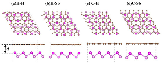(a)–(d) Top and side views of four stacked patterns (H-H, H-Sb, C-H, and C-Sb) for graphene/antimonene heterostructures, in which the brown and pink balls represent C and Sb atoms, respectively. d represents the interlayer distance between graphene and antimonene. The dash lines in every stacked structure represent the rhombus primitive cell.