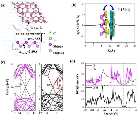 To further give insight into how the coating of graphene affects the electronic properties of the G/Sb system, we also investigated the charge transfer and charge density difference distributions. The planar averaged charge density difference along the z direction is plotted in Figure 2c, which is defined as