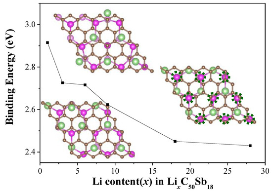 It is known that the performanceof LIBs relies greatly on the Li capacity of the anode materials. Therefore, it is of great importance to understand the electrochemical properties of different lithiated phases during the Li intercalation process by adding more Li atoms to the G/Sb heterostructure. The most stable structures of LixC50Sb18 (x = 1, 3, 6, 9, 18, and 28) in the process of Li intercalation were explored. For each concentration, we calculated several different configurations. After full geometry optimization, the variation of the averaged binding energy (Eb) as a function of the number of Li ions for the corresponding most stable configurations are shown in Figure 4. As the additional Li atoms are further inserted into the G/Sb, the average Eb decreases gradually from 2.73 eV to 2.43 eV with the number of inserted Li ions increasing from three to 28, which indicated that the G/Li/Sb structures are stable even at high Li concentrations. We found that the charge transfer from the Li atoms to the G/Sb at higher concentrations was reduced compared to that of lower concentrations. When the number of embedded Li increases, the interatomic distances between positively charged Li ions is also reduced. The reduction trend on the binding energy can be attributed to two main factors—(1) the weak electrostatic attraction between the G/Sb heterostructure and the Li cations, which is closely related to the reduction of charge transfer from Li to G/Sb at high concentrations, and (2) the enhanced Li–Li repulsion at high Li concentrations, which is resulted from the shorter Li–Li distance.