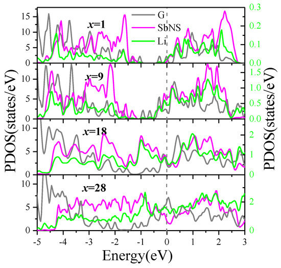 Density of states of LixC50Sb18 (x = 1, 9, 18, 28). The scale of left Y-axis is for the PDOS of graphene and antimonene, which is represented by the gray and red lines, respectively; the scale of right Y-axis is for the PDOS of Li labeled by green line.