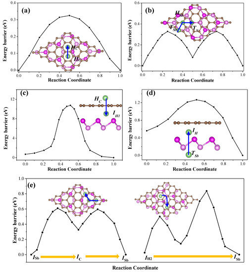 To investigate the diffusion properties of Li in the G/Sb heterostructure, the nudged elastic band (NEB) method was adopted to calculate the transition state and migration barrier [37,38]. All the geometry structures are fully relaxed until the total energies satisfied the convergence of 1.0 × 10−5 eV and forces on each atom smaller than 0.01 eV/Å, respectively.