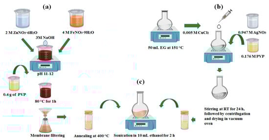All the necessary chemicals, including zinc nitrate hexahydrate (Zn(NO3)2·6H2O), iron nitrate nonahydrate (Fe(NO3)2·9H2O), silver nitrate (AgNO3), polyvinylpyrrolidone (PVP), ethylene glycol (EG, C2H6O2), copper (II) chloride dihydrate (CuCl2·2H2O), and sodium borohydride (NaBH4), were purchased from Sigma Aldrich (Yongin, South Korea). Other reagents like acetone, sodium hydroxide (NaOH), and ethyl alcohol (C2H5OH) were purchased from Daejung Chem. (Siheung, South Korea). All the chemicals and reagents were pure and used with no further treatment.