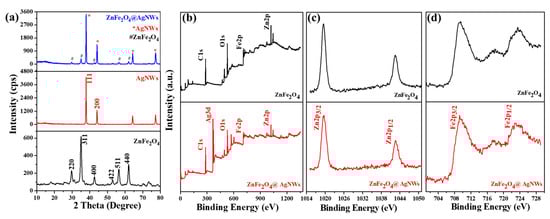 (a) XRD patterns of pure ZnFe2O4 NPs, AgNWs, and ZnFe2O4@AgNWs hybrid nanostructures. (b–d) XPS spectra of ZnFe2O4 NPs and ZnFe2O4@AgNWs hybrid nanostructures: (b) overall scans, (c) magnified spectra focused on Zn 2p levels, (d) magnified spectra focused on Fe 2p levels.