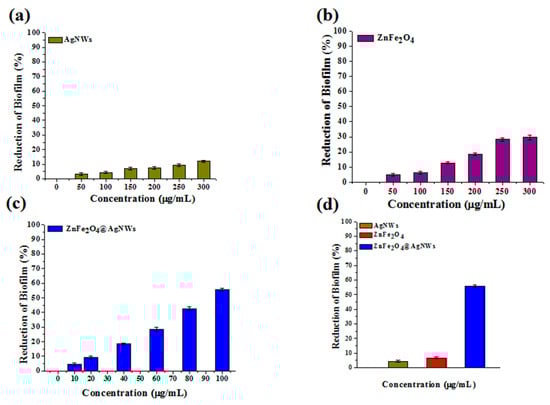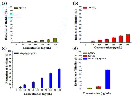 Reduction of biofilm versus nanostructure concentration bar charts obtained from crystal violet staining assays: (a) AgNWs, (b) ZnFe2O4 NPs, (c) ZnFe2O4@AgNWs hybrid nanostructures, (d) comparative reduction of biofilm at a specific concentration of 100 µg/mL. The reduction of biofilm was calculated from the optical density at the wavelength of 595 nm.