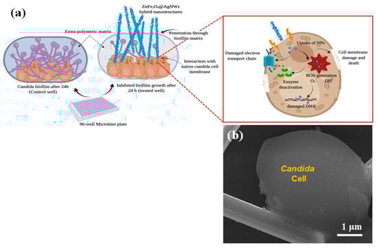(a) Schematic illustration of the biofilm inhibition mechanism. (b) High-resolution SEM image of Candida biofilm treated with ZnFe2O4@AgNWs hybrid nanostructures (100 µg/mL) after 24 h of biofilm formation.