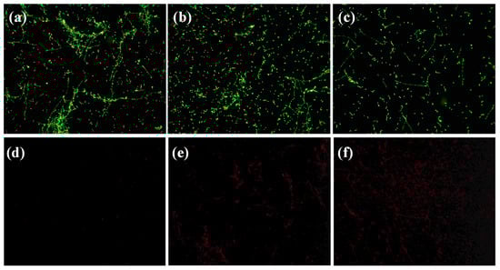 We stained a control biofilm and other biofilms treated with ZnFe2O4@AgNWs hybrid nanostructures (100 µg/mL) for different times, following the protocol described in the yeast visibility kit (Molecular Probes, Invitrogen, Thermo Fisher Scientific, Waltham, MA, USA). The biofilm images obtained by a fluorescent microscope are shown in Figure 8. For this imaging, two types of dyes (SYTO9 and propidium iodide) were used, which behave differently. SYT09 can penetrate cell membranes in both healthy and dead cells/hyphae, while propidium iodide is unable to pass through the cell membrane and binds to dead or damaged cells/hyphae. As a consequence, healthy cells appear green, whereas dead or damaged cells show red fluorescence. As can be seen in Figure 8a, the control biofilm shows strong, streaked green fluorescence, indicating active hyphal growth. Less hyphal growth and more C. albicans cells without hyphal development are observed for the 12-h-treated biofilm (Figure 8b). Further inhibition of hyphal growth and a lower density of C. albicans cells resulted in the biofilm treated for 24 h (Figure 8c). The distributions of dead or damaged cells (red fluorescence) for the same samples have the opposite trend to these healthy cell distributions (see Figure 8d–f). These results agree well with the observations from crystal violet assay, XTT assay, and SEM studies.
