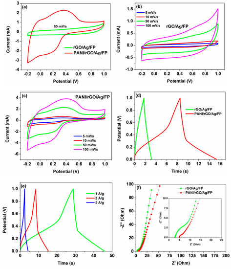 (a) Cyclic voltammetry (CV) curves of the rGO/Ag/FP and PANI/rGO/Ag/FP electrodes under the scanning rate of 50 mV/s; (b,c) CV curves of the rGO/Ag/FP and PANI/rGO/Ag/FP electrodes under different scanning rates, respectively; (d) galvanostatic charge-discharge (GCD) curves of rGO/Ag/FP and PANI/rGO/Ag/FP electrodes at the current density of 2 A/g; (e) GCD curves of PANI/rGO/Ag/FP electrode at different current densities; (f) Nyquist plots of rGO/Ag/FP and PANI/rGO/Ag/FP electrodes.