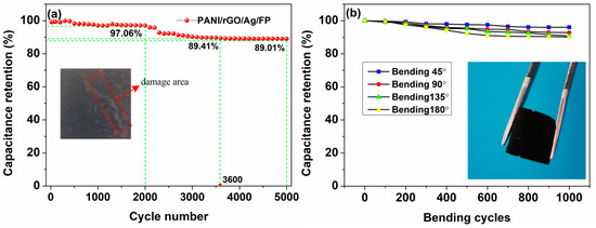 The long-term cycling tests of PANI/rGO/Ag/FP hybrid were conducted by CV at the scan rate of 50 mV/s for 5000 times. As displayed in Figure 6a, initially, the specific capacitance maintained a high level with 97.06% retention over the first 2000 cycles. However, there was a slight reduction of the specific capacitance when the cycling number approached 3600, which was attributed to the loss of detached active materials falling from the electrode and then travelling to the electrolyte during the charge-discharge process. The image of the sample after cycling tests was displayed in the Figure 6a inset. Finally, the specific capacitance remained in a stable state with the low deterioration rate of 10.99%, indicating an excellent cycle stability of the PANI/rGO/Ag/FP composite. For flexibility, the specific capacitance retention rates of the electrode were also calculated under different bending degrees of (45°, 90°, 135°, 180°) and repeated bending times (1000), respectively. As shown in Figure 6b, although the PANI/rGO/Ag/FP electrode experienced a maximum bending degree of 180° and the highest number of bending times, the calculated retention rate remained as high as 90.1%.