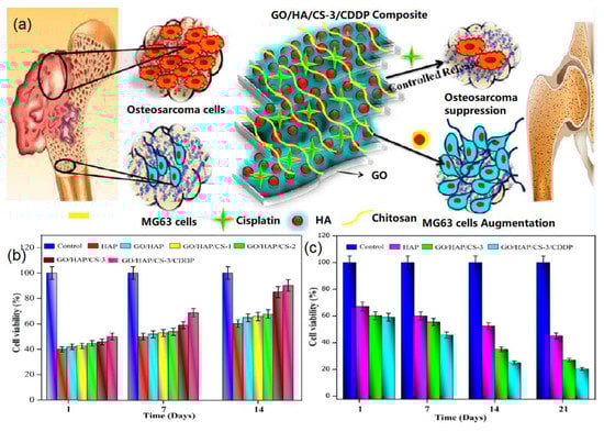 - Sumathra, M.; Sadasivuni, K.K.; Kumar, S.S.; Rajan, M. Cisplatin-loaded graphene oxide/chitosan/hydroxyapatite composite as a promising tool for osteosarcoma-affected bone regeneration. ACS Omega 2018, 3, 14620–14633. [Google Scholar] [CrossRef] [PubMed]