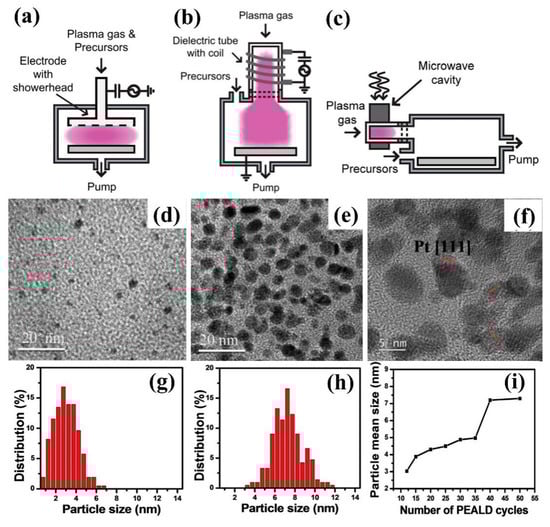 Plasma enhanced atomic layer deposition (PEALD) technology (a) direct plasma enhanced atomic layer deposition; (b) remote plasma enhanced atomic layer deposition; (c) radical-enhanced atomic layer deposition [13] (Reproduced with permission from [13], American Vacuum Society, 2007.) HRTEM images of samples with different PEALD deposition times: (d) 12 times, (e) 50 times, and (f) 40 times. Corresponding particle size distribution maps: (g) 12 times and (h) 50 times. (i) The graph of relationship between the average particle size distribution and the number of depositions [15]. (Reproduced with permission from [15]. Elsevier B.V., 2015).