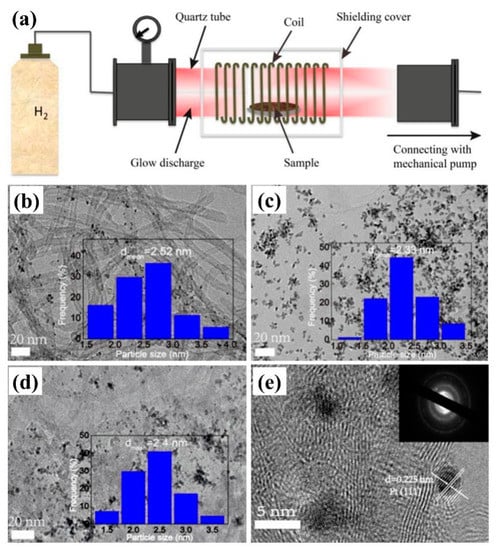 (a) The sketch of device for sample treatment by H2 plasma. TEM images and corresponding Pt particle size distribution images: (b) Pt/carbon nanotubes (CNTs), (c) Pt/RGO, and (d) Pt/GNT (graphene oxide (GO):CNTs = 1:2, mass ratio). (e) HRTEM and SAED images of Pt/GNT [20]. (Reproduced with permission from [20]. Elsevier B.V., 2018).