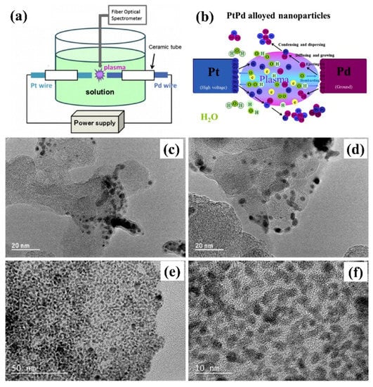 (a) The experimental device and (b) the schematic diagram of PtPb nanoparticles synthesized by solution plasma sputtering. Catalysts formed in different solutions: (c,d) PtPd/KB in aqueous solution; (e,f) PtPd/KB-2 in water-methanol mixture [30]. (Reproduced with permission from [30]. Elsevier B.V., 2017).