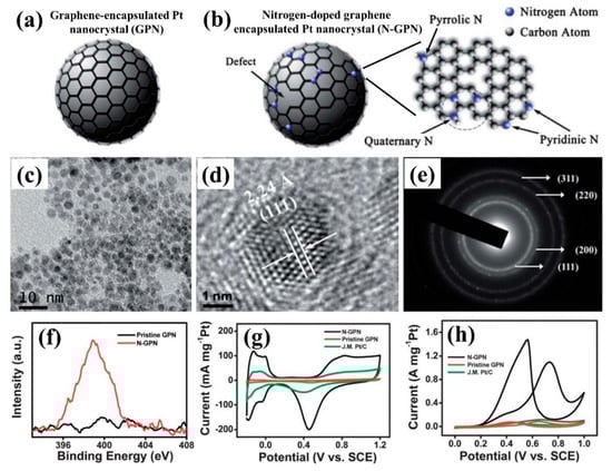 The schematic diagram of (a) graphene-supported Pt nanoparticles (GPN) and (b) N-doped GPN (N-GPN); The images of (c) TEM, (d) HRTEM, and (e) selected area electron diffraction (SAED) for GPN; (f) XPS image; (g) chemical vapor (CV)—0.5 M H2SO4, and (h) CV—0.5 M H2SO4 + 1.0 M CH3OH for GPN and N-GPN [45]. (Reproduced with permission from [45]. American Chemical Society, 2014).