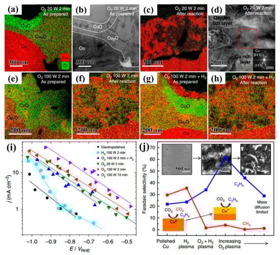 Cu-based catalysts are commonly used in the preparation of hydrocarbons by CO2RR, such as carbon monoxide, methane, ethylene, ethanol, and n-propanol [51]. Mistry et al. [52] used plasma to treat oxidized Cu-based catalysts for the catalytic reduction of CO2 at low overpotential. It can be seen from Figure 8a–h that Cu2O was not completely reduced during the reaction, and Cu+ ions were still on the surface. Cu-based catalysts derived from oxides only had a minimal effect on catalytic performance, while Cu+ played an important role in reducing the initial potential and improving the selectivity of ethylene. Among the catalysts, Cu foil treated by O2 plasma had 60% ethylene selectivity at −0.9 V (versus reversible hydrogen electrode (RHE)) potential (Figure 8i,j). In 2017, Gao et al. [53] adjusted Cu (100) crystal face and the content of oxygen/chloride ion by treatment of Cu nanoparticles with H2, O2, and Ar plasma, respectively. It was found that the oxygen content on the surface and subsurface of Cu nanoparticles was the key to achieve high activity and selectivity of hydrocarbons/alcohols, even more important than the existence of the Cu (100) crystal plane. Cu nanoparticles treated by O2 plasma had lower overpotential and higher selectivity for ethylene, ethanol, and n-propanol, of which the selectivity for ethylene and ethanol was 45% and 22%, and the maximum Faraday efficiency (FE) of C2 and C3 products can reach 73%.