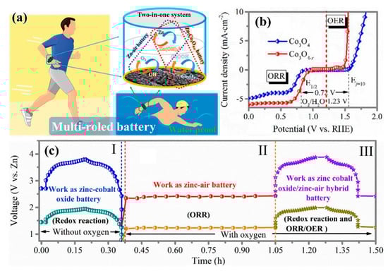 (a) The schematic diagram of Zn–Co3O4−x/Zn-air hybrid battery; (b) the overall polarization curve of Co3O4 nanorods and Co3O4−x; (c) the constant current charge/discharge curve of Zn–Co3O4−x /Zn-air hybrid battery. (I) Work of the Zn–Co3O4−x battery in an anaerobic environment; (II) Work of the zinc-air battery in an aerobic environment; (III) Work of the hybrid battery in an aerobic environment [62]. (Reproduced with permission from [62]. American Chemical Society, 2018).
