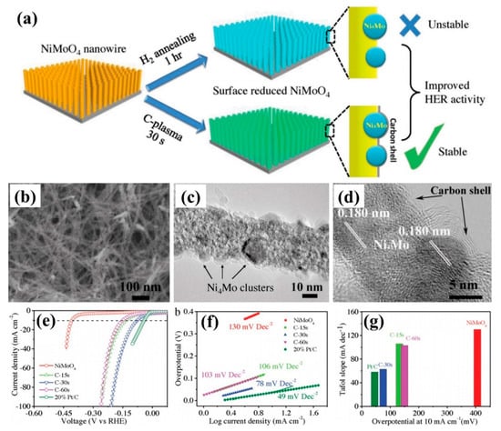 (a) The preparation of C-plasma treated and H2 annealed NiMoO4; (b) SEM and (c,d) TEM images of the sample C-30s; the electrochemical performance tests of the sample: (e) linear sweep voltammetry (LSV) curve, (f) Tafel slope, and (g) the relationship between overpotential and Tafel slope at current density of 10 mA/s [83]. (Reproduced with permission from [83]. Wiley-VCH, 2018).