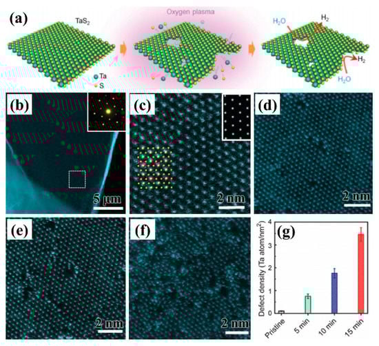 Transition metal sulfides which have received extensive attention in recent years, have become new and highly efficient electrocatalysts, particularly HER catalysts. The hydrogen evolution reaction mainly occurs at the boundary of 2D materials in which the atom is incompletely coordinated. Therefore, the preparation of 2D transition metal sulfides with incompletely coordinated atomic boundaries is the key to whether the material can replace the noble metal platinum. Li et al. [85] etched 2D TaS2 nanosheets by using O2 plasma technology. It was found that the plasma could control the processing of high-density atomic-scale pores on three-dimensional (3D) two-layer crystals, which can increase the catalytic sites and effectively improve the hydrogen evolution catalytic activity of 2D materials, as shown in Figure 14a. As can be seen from Figure 14b–g, the atomic defect density increased with the increase of processing time, which exhibited excellent HER catalytic activity of treatment at 15 min.