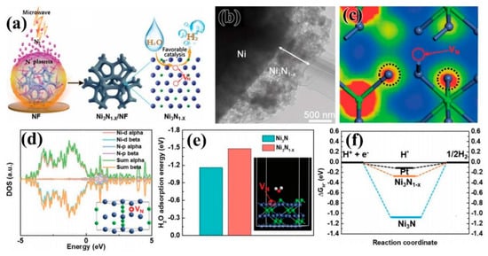 (a) Schematic diagram of preparation of self-supporting Ni3N1−x/NF electrode by microwave plasma-generation; (b) TEM images, (c) charge density distribution, and (d) the total electron density and partial electron density (TDOS and PDOS) of Ni3N1−x/NF; (e) adsorption energy of H2O molecules on the surface of Ni3N and Ni3N1−x; (f) free energy of H adsorption by various substances at equilibrium potential [102] (open access).