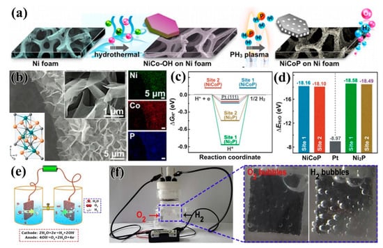 Transition metal phosphides have attracted great interest as electrocatalytic catalysts, particularly for HER and OER catalysts for electrocatalytic water splitting [106]. Currently, bimetallic phosphides exhibit higher catalytic activity than monometallic compounds [107] Liang et al. [108] realized the transition of NiCo–OH to NiCoP on nickel foam by PH3 plasma, and prepared NiCoP electrocatalysts, as shown in Figure 17a, which exhibited excellent HER and OER electrocatalytic activity under alkaline conditions (Figure 17b–d). Zhang et al. [109] used plasma-enhanced chemical vapor deposition (PECVD) to form phosphate and phosphide groups on foamed nickel in the presence of PH3, CO2, and H2 to form NiFePi/P. The change in the surrounding electronic environment of metal ions, due to the strong synergistic effect between phosphate and phosphide, not only increased the active center, but also improved the wettability and metal properties of the catalyst, the high conductivity, the wettability, and the active sites, which lead to excellent OER performance in an alkaline solution.