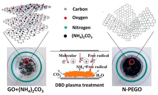 - Wang, Y.; Yu, F.; Zhu, M.; Ma, C.; Zhao, D.; Wang, C.; Zhou, A.; Dai, B.; Ji, J.; Guo, X. N-Doping of plasma exfoliated graphene oxide via dielectric barrier discharge plasma treatment for the oxygen reduction reaction. J. Mater. Chem. A 2018, 6, 2011–2017. [Google Scholar] [CrossRef]