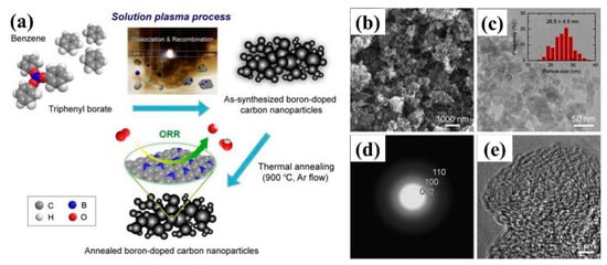 - Panomsuwan, G.; Saito, N.; Ishizaki, T. Electrocatalytic oxygen reduction activity of boron-doped carbon nanoparticles synthesized via solution plasma process. Electrochem. Commun. 2015, 59, 81–85. [Google Scholar] [CrossRef]