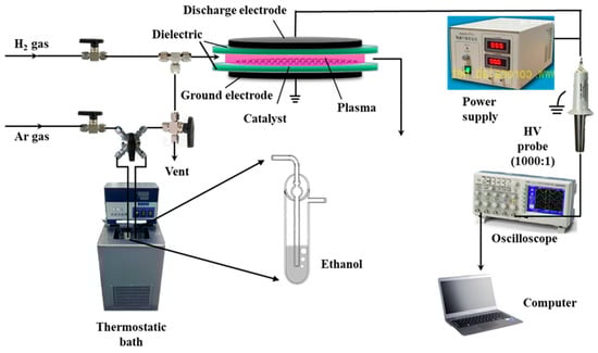 Ethanol, a hydrogen-rich renewable resource, can be mixed with water in any proportion and shows reducibility. Research on reforming hydrogen production from ethanol has recently gained interest [,,]. Plasma technology has been used to reform hydrogen production from ethanol. Wang et al. used microwave plasma (2.45 GHz) to produce hydrogen from low carbon alcohol (methanol and ethanol) solutions and evaluated the effect of microwave power input and alcohol concentration on hydrogen production. Results indicated that not only hydrogen but carbon species (such as acetylene, CO and CO2) as well are produced during microwave discharge []. Wu et al. reported on the synthesis of a Ni/γ-Al2O3 catalyst by dielectric barrier discharge, which increased the conversion rate of ethanol to hydrogen by nearly 30%, meanwhile, the carbon balance was 97% [].