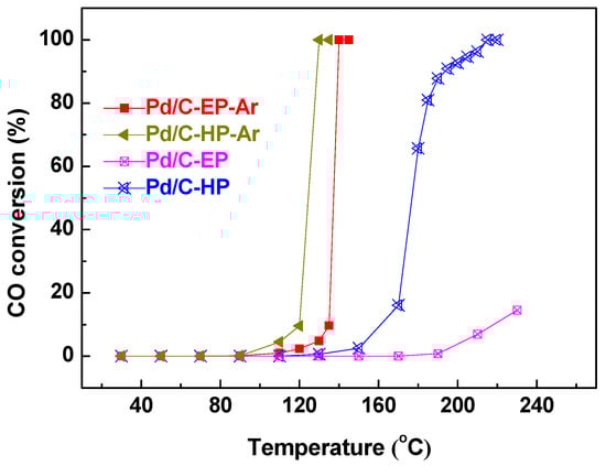 Figure 2 presents the CO oxidation reactivity of the Pd/C samples prepared by AP ethanol and hydrogen cold plasma. The 100% CO conversion temperature (T100) of Pd/C-EP-Ar, Pd/C-HP-Ar, and Pd/C-HP were 140 °C, 130 °C, and 215 °C, respectively. Notably, no CO oxidation activity over Pd/C-EP was observed even at 200 °C, and the conversion rate of CO at 230 °C was only 14.5%. The significantly lower CO oxidation reactivity over Pd/C-EP than that over Pd/C-HP is mainly attributed to the carbon layer formed by ethanol decomposition during plasma treatment, which will be discussed later. The results show that the T100 of Pd/C-EP-Ar is similar to the T100 of Pd/C-HP-Ar, indicating that AP ethanol cold plasma can achieve the same effect and ability as that of AP hydrogen cold plasma in the preparation of Pd/C catalytic materials, and its advantage is that the use of explosive H2 gas is prevented. In this work, the theoretical load of Pd is 5 wt%. The T100 of Pd/C-EP-Ar (140 °C) is close to the previously reported 6 wt% Pd/graphene (127 °C) fabricated by the thermal reduction method [].