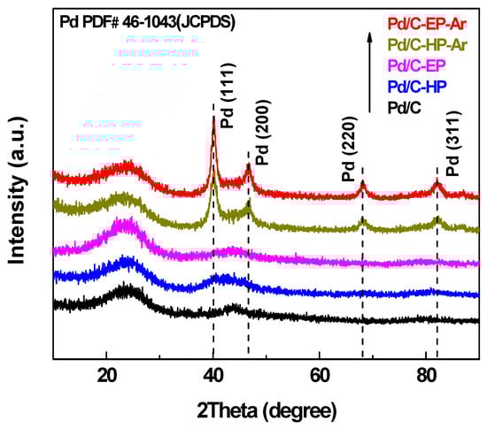 The XRD patterns of the Pd/C-EP, Pd/C-EP-Ar, Pd/C-HP, Pd/C-HP-Ar, and Pd/C precursor are illustrated in Figure 3. The broad diffraction peaks at ca. 23°, 44° and 80° of all samples corresponded to the (002), (100) and (111) planes of graphitic carbon structure of the support []. These peaks are weak and broad, revealing a poor crystallite graphitic structure. Meanwhile, the characteristic diffraction peaks of Pd/C-EP-Ar and Pd/C-HP-Ar at 40.1°, 46.6°, 68.1°, and 82.4° corresponded to the (111), (200), (220), and (311) planes of metal Pd (JCPDS#46-1043), respectively. However, the Pd peaks for Pd/C-EP and Pd/C-HP were weaker than those of Pd/C-EP-Ar and Pd/C-HP-Ar, only the Pd peak at 40.1° was observed. The diffraction peak of Pd/C-EP at 25.0° was stronger than that of the support and other samples. This difference may be attributed to the carbon species formed on the material surface by ethanol decomposition during plasma discharge. Pd in Pd/C-EP-Ar and Pd/C-HP-Ar showed strong and sharp peaks, indicating that the nanoparticle size of Pd was relatively large owing to the agglomeration of Pd nanoparticles. Such agglomeration resulted from calcination at high temperatures in Ar gas.
