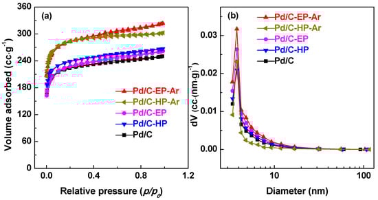 To evaluate the effect of plasma treatment on the pore structure of the Pd/C catalytic materials, the N2 adsorption and desorption and pore size distribution of all samples were observed (Figure 4). The specific surface area, pore diameter, and pore volume of the Pd/C samples are summarized in Table 1. The Pd/C catalytic materials in descending order of specific surface area were Pd/C-EP-Ar > Pd/C-HP-Ar > Pd/C-HP > Pd/C-EP > Pd/C with the corresponding specific surface areas of 874, 871, 736, 703, and 690 m2·g−1, respectively (Figure 4a & Table 1). Correspondingly, the pore volumes of the Pd/C-EP-Ar and Pd/C-HP-Ar samples increased to 0.50 and 0.47 cm3·g−1, respectively. Compared to Pd/C-HP and Pd/C-EP, the specific surface area and pore volume of the Pd/C-EP-Ar and Pd/C-HP-Ar samples were increased, which may be mainly ascribed to the removal of the unstable carbon species in the presence of active Pd species during calcination.