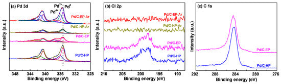 X-ray photoelectron spectroscopy (XPS) spectra of (a) Pd 3d and (b) Cl 2p in Pd/C-EP-Ar, Pd/C-HP-Ar, Pd/C-EP and Pd/C-HP, as well as (c) C1s XPS spectra in Pd/C-EP and Pd/C-HP.