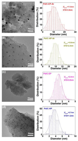 Typical transmission electron microscopy (TEM) images of (a) Pd/C-EP-Ar, (b) Pd/C-HP-Ar, (c) Pd/C-EP, and (d) Pd/C-HP and the corresponding histograms of the size distribution of the Pd nanoparticles.