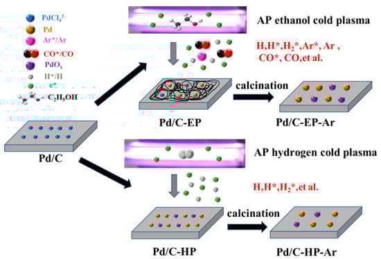 In a previous study, metal (Au, Pd, Ag, Pt) ions loaded on Deggusa P25 (commercial titania) were successfully reduced by combining AP cold plasma with ethanol instead of H2, and Pd/P25 catalytic materials with high activity and small Pd nanoparticles were prepared by AP ethanol cold plasma treatment. The performance was better than that of the catalytic materials prepared using AP hydrogen cold plasma [,]. The structure, specific surface area, and other properties of supports influence the catalytic materials, thus, supports play an important role in these materials. Activated carbon has been widely used as a support because of its high-specific surface area (500–1700 m2·g−1) and rich oxygen-containing functional groups located on the surface. In addition, activated carbon is cheap and conducive to the recovery of precious metals. In this study, activated carbon was selected as the support, and AP ethanol cold plasma was used in the fabrication of Pd/C catalytic materials.