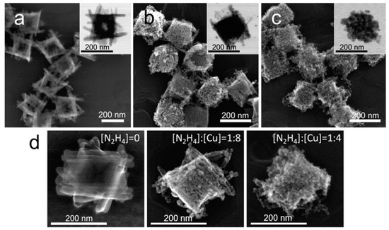 However, when a 20-fold excess of hydrazine was introduced to extensively washed Cu(OH)2 nanocages, the resultant branched particles were substantially larger in size (ranging from 250 nm up to 2 µm) and had a large size variation (Figure 2b,d). This increase in size suggests that extensive removal of PVP ligands enabled interparticle surface interaction and their subsequent association coinciding with the structural transition. Considering the presence of the excess hydrazine during the reaction and the accessibility of the particle surface due to the lack of PVP, interparticle attachment could be induced by hydrazine acting as a linker between particles. Indeed, due to the presence of lone pairs on both nitrogen atoms in N2H4, hydrazine could behave as a bidentate ligand, and a number of coordination compounds of Cu(II) and Cu(I) containing hydrazine were reported in earlier literature [37,38,39]. Thus, particle attachment regime was the first indication of excess hydrazine integrating into the final structure. A further compositional analysis is provided in the following section.