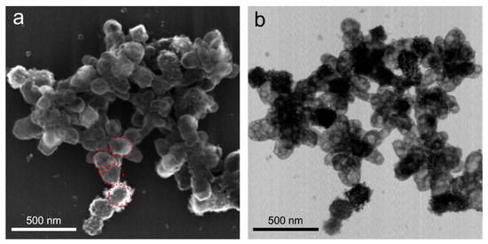 Structures obtained from Cu(OH)2 nanocages upon their reduction with 4-fold excess hydrazine compared to the stoichiometric ratio. SEM (a) and TEM (b) images correspond to the same sample area. Red circles in (a) correspond to the average size of Cu(OH)2 cores and are shown for eye guidance and comparison.