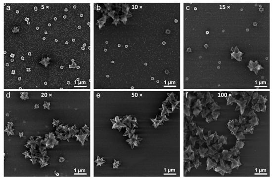 SEM images of the structures obtained from Cu(OH)2 particles upon their reduction with 5-fold (a), 10-fold (b), 15-fold (c), 20-fold (d), 50-fold (e), and 100-fold (f) excess hydrazine compared to the stoichiometric ratio.